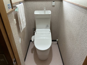 トイレ交換 津島市 トイレリフォーム BEFORE トイレ床が水漏れのために腐って沈んでしまっていたので床のコンパネを撤去しました。 AFTER 床を貼り直し、クッションフロアとソフト巾木を貼り内装工事完了。 そこに、Panasonicのトイレを取り付けしました。 トイレ交換